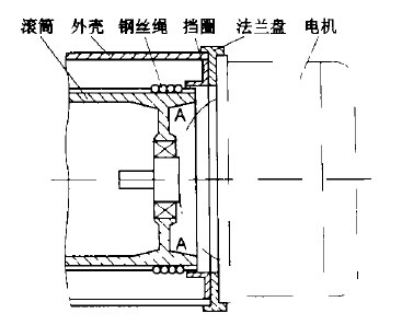 鋼絲繩電動葫蘆在使用過程中經(jīng)常發(fā)生纏繩事故。特別是當(dāng)鋼絲繩卡于滾筒與升降電機(jī)之間的縫隙時(shí)(圖1中A區(qū)),處理的方法只能是拆下電機(jī),取出鋼絲繩。既費(fèi)時(shí),又費(fèi)力,還耽誤正常的生產(chǎn),有時(shí)為了維持生產(chǎn),將鋼絲繩用氣焊割斷,留下的斷鋼絲繩極容易磨損滾筒和電機(jī)外殼,造成更大的設(shè)備事故。