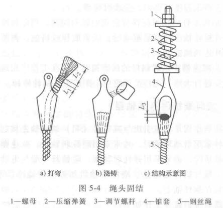 電梯是多繩提升,數(shù)根鋼絲繩共同承擔負載。多繩提升要求每根鋼絲繩受力均等,不允許個別鋼絲繩受力過大(即繃得太緊)。因此電梯都有鋼絲繩張力調(diào)整裝置,用擰緊或放松螺母改變彈簧力的辦法,即可調(diào)整鋼絲繩的張力(見圖5-4c)。彈簧還可起微調(diào)作用,瞬時平衡力由彈簧不長。由于數(shù)根彈簧性能有差別,因而不能用測量壓縮彈簧的長度來衡量鋼絲繩受力是否相等,更不能一次作為調(diào)整依據(jù)。