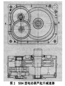 在起重機(jī)械中生產(chǎn)量最大,使用最廣泛的電動(dòng)葫蘆,它選擇不到標(biāo)準(zhǔn)減速器,它必須由設(shè)計(jì)者感覺(jué)電動(dòng)葫蘆起升機(jī)構(gòu)總體的設(shè)計(jì)要求設(shè)計(jì)電動(dòng)葫蘆專用的起升減速器,當(dāng)然也包括設(shè)計(jì)電動(dòng)小車(chē)的減速器。按圖1的總體部件的布置,起升減速器一端與電動(dòng)機(jī)鏈接,另一端與卷筒裝置鏈接。電動(dòng)機(jī)的輸出軸頭是小齒輪,它與減速器第一級(jí)大齒輪嚙合:減速器的最后一級(jí)輸出軸是花鍵,它直接雨卷筒鏈接。SH4型減速器見(jiàn)圖2.
