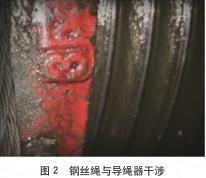 1)升降機運行異響來源于鋼絲繩與導繩器的干涉(如圖 2 所示),由于吊鉤與貨廂龍門架吊耳的安裝位置不合理,致鋼絲繩處于斜拉狀態(tài),使導繩器與鋼絲繩干涉,造成導繩器排繩效果不良,使鋼絲繩脫離卷筒繩槽,發(fā)生鼓包現(xiàn)象。升降機的沖頂使電動葫蘆外殼變形,故造成鼓包處鋼絲繩與電動葫蘆變形外殼干涉,導致該處鋼絲繩磨損斷絲。