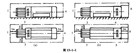 將電動葫蘆安裝在試驗臺上,測量時以整機最大外廓尺寸為測距的計算起點線,測點位置布置在自起點向外擴展1m平行線上,如圖13-1-1所示。起升機構(gòu)的電動機與減速器位于卷筒位置的同端時,則測點如圖13-1-1(a)所示的1、2、3、4共四點。如電動機與減速器分別布置在卷筒兩端,則測點如圖13-1-1(b)所示的1、2、3、4、5、6共六點,測點距反射面(墻壁、立柱、機床等)和其他物體應(yīng)不小于1m,距墻角應(yīng)不小于2m。
