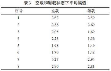 檢測時,電動葫蘆應(yīng)處于規(guī)定的運行狀態(tài),即電動葫蘆在額定轉(zhuǎn)速、額定電壓下的穩(wěn)定工作狀態(tài)。如果所測振動大于該方法所允許接受的范圍,且受過度背景干擾,應(yīng)停機進(jìn)行檢測,以確定外界的影響程度。機器靜止時所測振動烈度值(速度的均方根值)超過運行時的25%,必須進(jìn)行修正,以減少背景振動對檢測的影響。本研究選擇鋼絲繩電動葫蘆空載時對其運行狀況進(jìn)行檢測。空載運行時,將采用振動檢測的方法得到的速度的均方根值中最大值作為參考數(shù)值。此外,對選擇在空載還是帶載的情況下對電動葫蘆進(jìn)行檢測也進(jìn)行了研究。對電動葫蘆減速箱進(jìn)行檢測的同時,不考慮電動葫蘆沿軌道運行的情況,因為這時減速箱并不工作,而只考慮電動葫蘆的空載升降、帶載升降狀態(tài)。針對這樣的狀況,在試驗過程中選取了8臺電動葫蘆,分別對這8臺電動葫蘆空載上升、額載上升的兩種穩(wěn)定的工作狀態(tài)進(jìn)行振動檢測,得到振動烈度、方根幅值、平均幅值這三個主要參數(shù),并分析上述兩種狀態(tài)下這三個參數(shù),參數(shù)與分析見表1、表2、表3