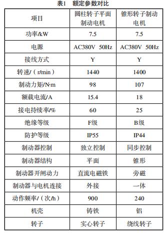 以功率7.5kW、極數(shù)4、轉(zhuǎn)速1440r/min的電機(jī)為例,圓柱轉(zhuǎn)子平面制動(dòng)電機(jī)與錐形轉(zhuǎn)子制動(dòng)電機(jī)的額定參數(shù)對(duì)比如表1所示。